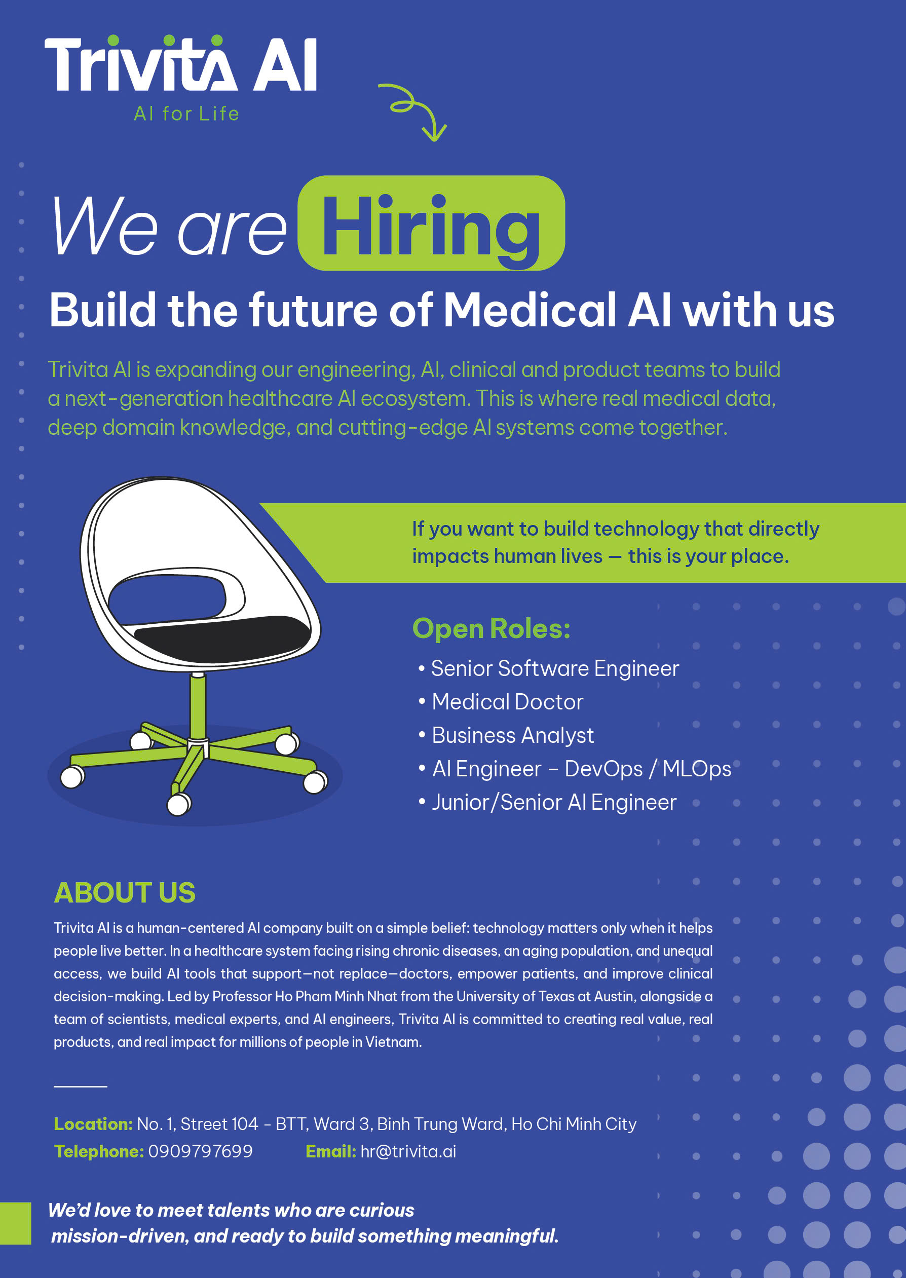 Trivita AI không chỉ xây dựng công nghệ — chúng tôi định nghĩa lại cách AI hỗ trợ và đồng hành cùng nhân loại. Từ các ứng dụng hàng ngày đến các giải pháp đa lĩnh vực tiên tiến, Trivita AI đang xây dựng một hệ sinh thái trí tuệ nhân tạo lấy con người làm trung tâm — nơi công nghệ được chế tạo để hiểu, phân tích và phục vụ con người tốt hơn mỗi ngày. Nếu bạn muốn xây dựng công nghệ tác động trực tiếp đến cuộc sống con người — đây chính là nơi dành cho bạn.